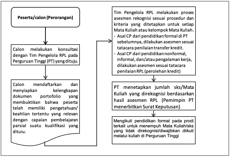Rekognisi Pembelajaran Lampau yang selanjutnya disingkat RPL adalah pengakuan atas Capaian Pembelajaran (CP) seseorang yang diperoleh dari pendidikan formal, non formal, informal, dan/atau pengalaman kerja sebagai dasar untuk melanjutkan pendidikan formal dan untuk melakukan penyetaraan dengan kualifikasi tertentu. Sebagaimana dinyatakan pada pasal 2, Peraturan Menteri Pendidikan, Kebudayaan, Riset dan Teknologi Nomor 41 Tahun 2021, penyelenggaraan RPL meliputi: